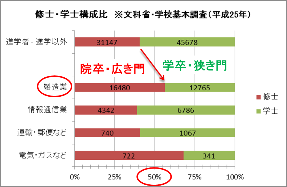 このように大学院進学者は、特に製造業(メーカー)への就職については、少ない人数で広い採用枠を目指すことになります。すなわち、