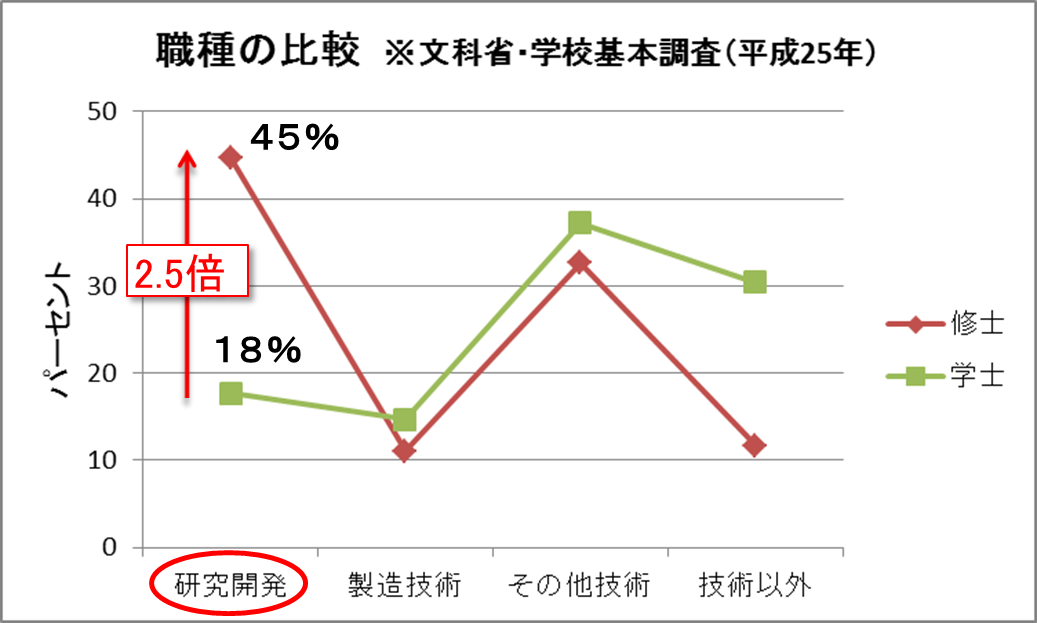このように、研究開発職に修士が占める割合は、学士の約2.5倍ということが分かります。したがって、