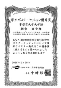 馬渕研究室の朝倉 直⾳さんが,2025年10月15-17日に開催された自動車技術会2025年秋季大会にて,学生ポスターセッション優秀賞を受賞しました!
